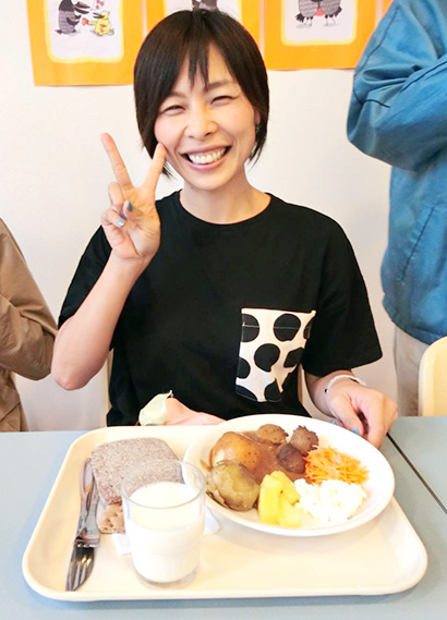 【写真:フィンランドの小学校で学校給食をいただく秋山もえ県議 】
