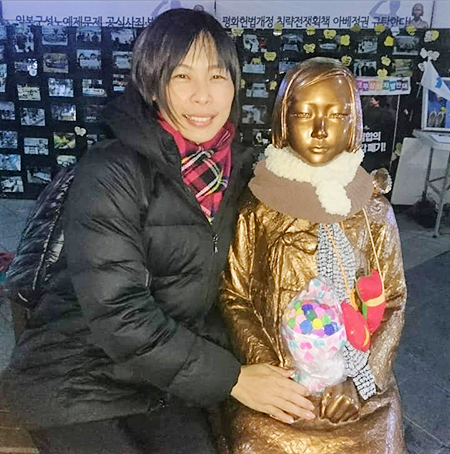 【写真:韓国ソウル市の日本大使館前にある「少女像」と共に 】