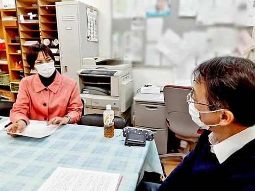 【写真:上尾市教職員組合の佐々木執行委員長と懇談する秋山もえ県議】