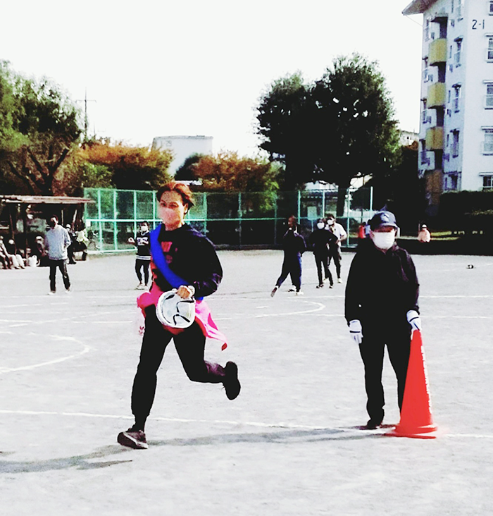 【写真:団地の運動会で防災リレーをする秋山もえ県議】