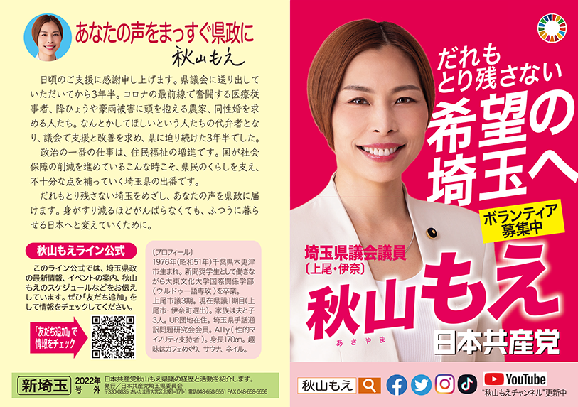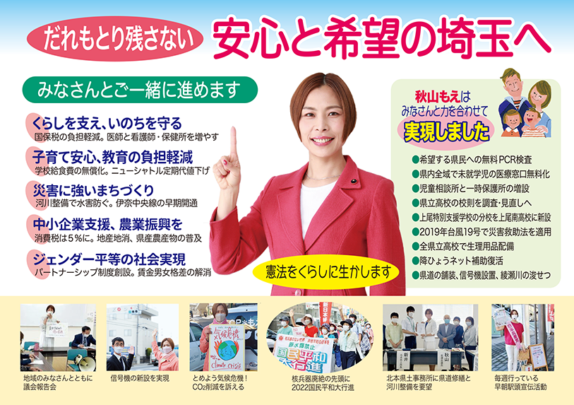 だれもとり残さない、希望の埼玉を目指し、あなたの声を県政に届けるこの仕事、引き続き、私、秋山もえに担わせてください。