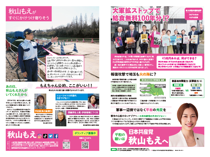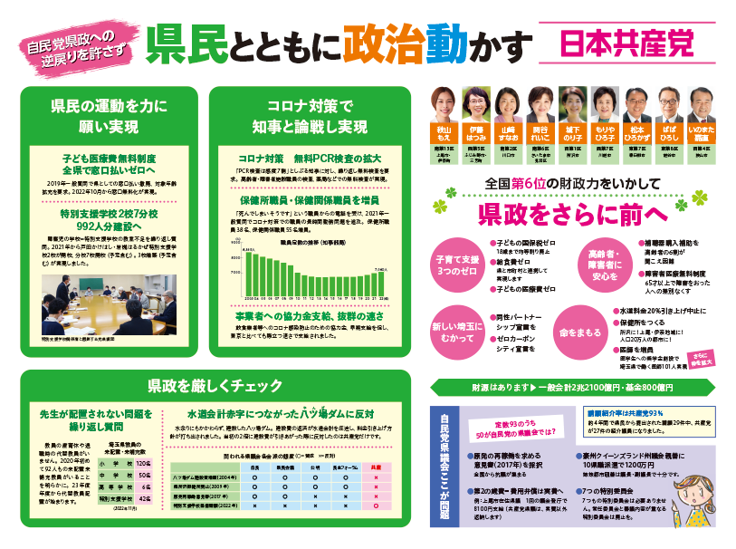 ところが今、国がやることは、最低限以下の支援ばかりです。こんな時こそ、県民のくらしを支え、不十分な点を補っていく埼玉県が頑張る時です。国が、大軍拡と大増税を進めようとしている今、この動きを埼玉から止めていくときです。